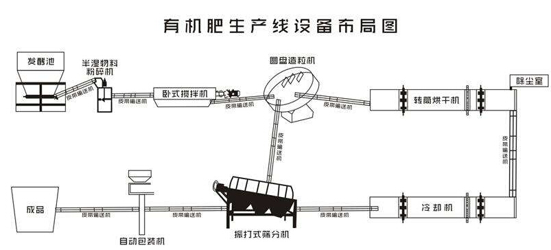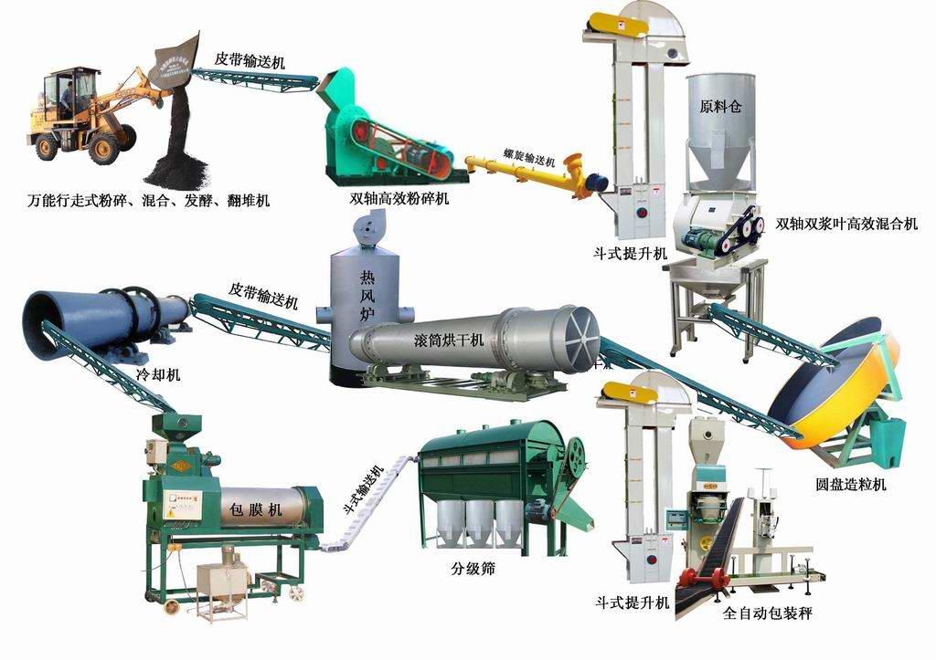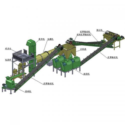 有机肥生产线设备配置: 高配置:脱水机、发酵翻堆机、储料仓、半湿物料粉碎机、卧式搅拌机、造粒机、烘干机、冷却机、滚筒筛分机、包膜机、包装设备、皮带输送机等。 中配置:储料仓、半湿物