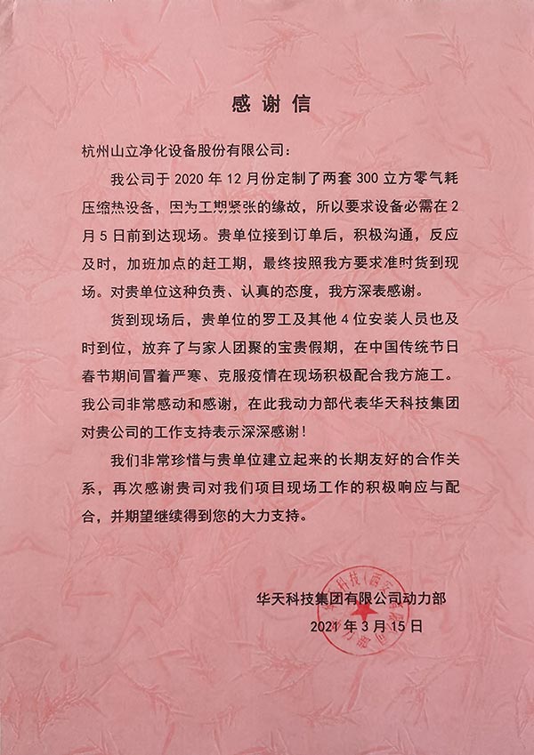 杭州yl23411永利官网登录净化设备股份有公司收到一封来自华天科技集团有限公司感谢信。信中,华天科技集团有限公司主要对我司的设备生产团队,售后服务团队的全力支持和协助表示感谢。
