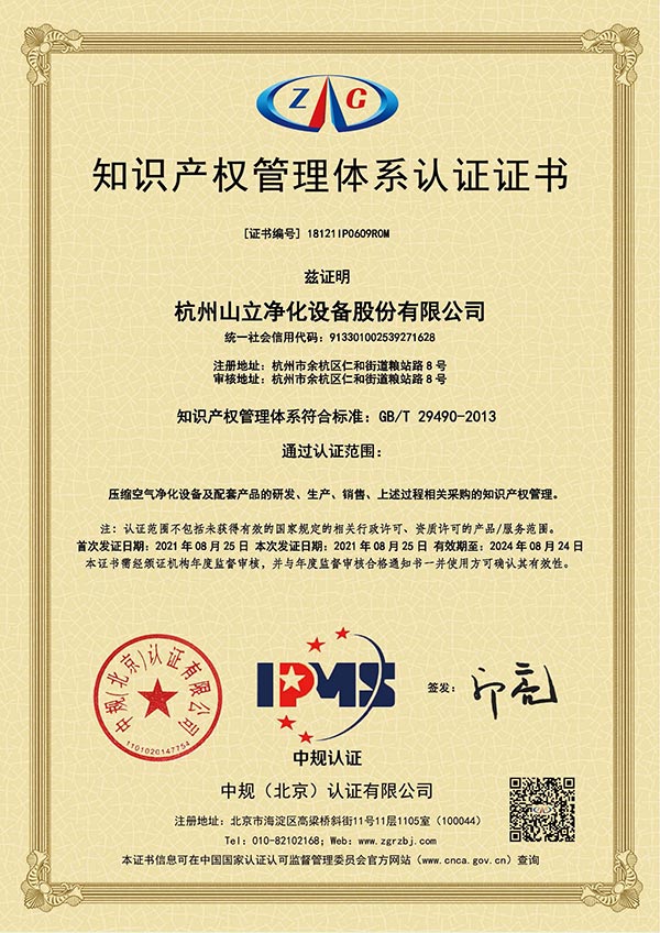杭州yl23411永利官网登录净化设备股份有限公司顺利通过知识产权管理体系审核,并于2021年8月25日获得由中规(北京)认证有限公司颁发的“知识产权管理体系认证”证书。