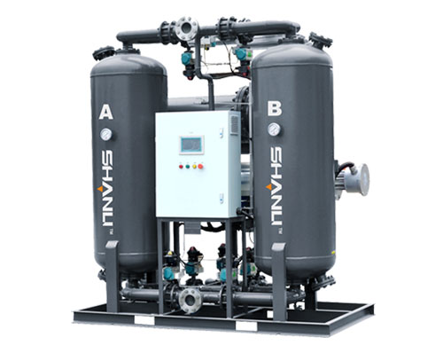 采用鼓风机抽取环境空气,经过加热后去再生吸附塔的干燥剂,避免了微热再生吸附式干燥器在加热阶段的耗气损失,只是在冷吹阶段采用一小部分成品气,因此整体耗气量小,特别适用于要求再生耗气量小的场合。同时由于鼓风热吸附式干燥器在在加热再生时无耗气,更大程度地节约了能量。